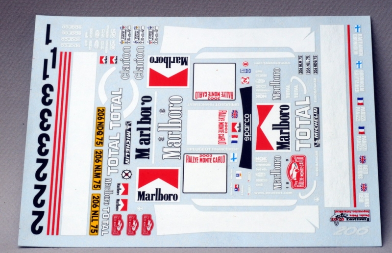 Transkit pour base Tamiya composé de : 1décal, 1aileron evo3, 1capot evo3, 1 tableau de bord, 1 téléphone portable et son support, grilles de capot photodécoupées, 1 boîtier Vidéo/GPS.