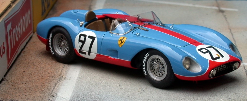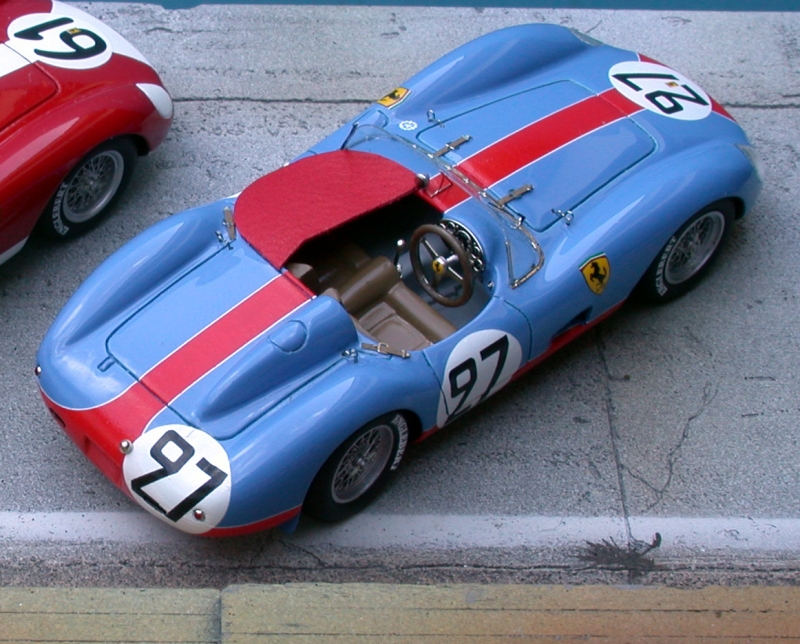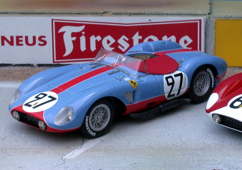 La dernière mouture de la gamme des Ferrari 2 litres (née en 54 avec le 4 cylindres dérivé des 500F2 de52/53) est probablement la plus belle, sinon la plus fine (sauf avec la capote imposé par l'annexe C de la CSI, d'où le nom: TR"C"...), et servira de base aux futures 250 Testa Tossa. Elle sera surtout la monture préférée de nombreux pilotes privés, qui signeront de belles victoires de classe...